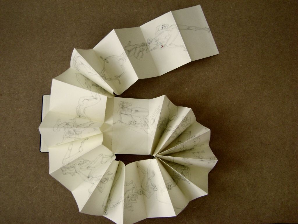 Je joue avec la contrainte du carnet Moleskine®. Le format japonais offre des bords, des parois, des plis, des déploiements, des rapprochements.